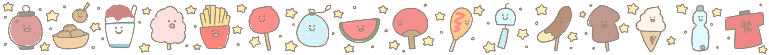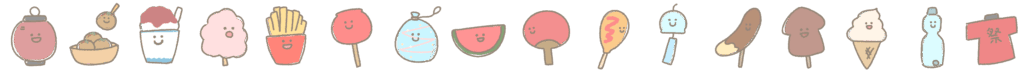 HOME > ライン > 夏祭りのライン 2025年4月18日 夏祭りのモチーフをラインにしたイラストです。 画像を長押しで保存できます。 ご利用に関しては利用規約をご確認ください✨素材のイラストリクエストなどはお問い合わせからお気軽にご連絡ください✨ Twitter Share Pocket Hatena LINE URLコピー この記事を書いた人 くまぴ ゆる可愛いイラスト描きます🌷 お問い合わせや素材のリクエストは 問い合わせフォームかInstagram DMまでお待ちしています✨ -ライン, 季節, 食べ物 -夏祭り